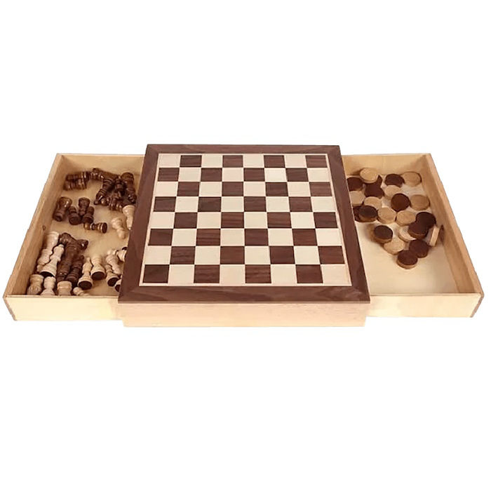 Παιχνίδι σκάκι-ντάμα με πιόνια και ξύλινη κασετίνα, ιδανικό για τους λάτρεις των στρατηγικών παιχνιδιών.