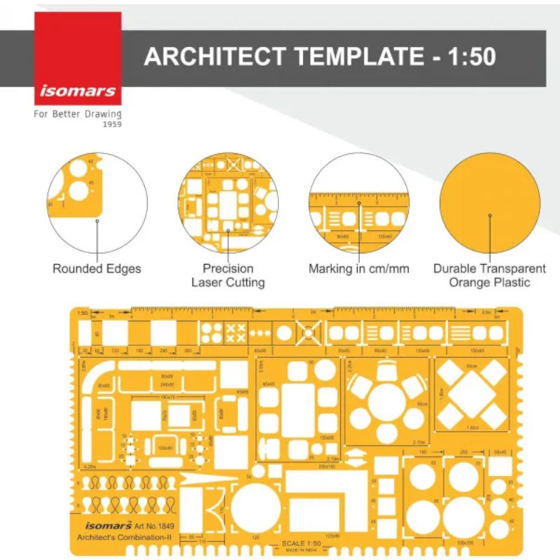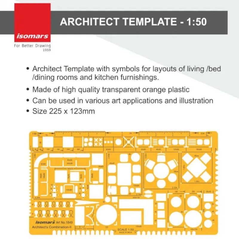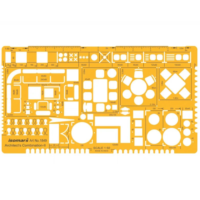 Στένσιλ αρχιτεκτονικής σε κλίμακα 1:50. Το πρότυπο είναι κατασκευασμένο από ημιδιαφανές κίτρινο πλαστικό και έχει διαστάσεις 225 x 123 mm.