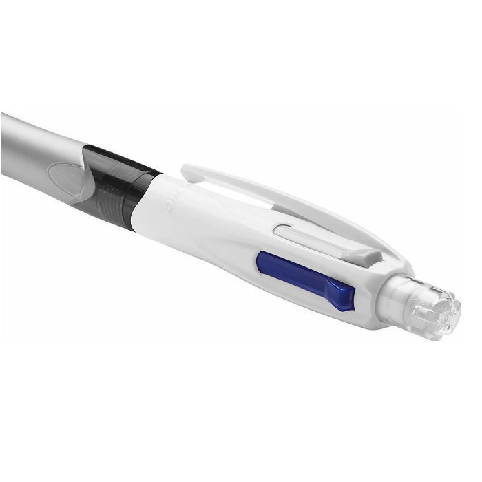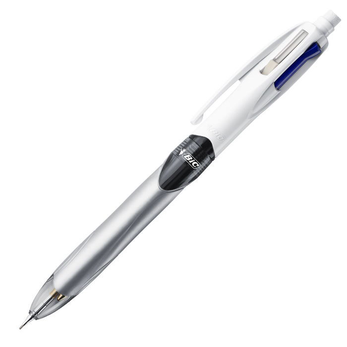 Στυλό από την BIC με μελάνι διαρκείας με 3 χρώματα! κόκκινο, μπλε, μαύρο και ένα μολύβι με μύτη πάχους 0,7 mm.. Διαθέτει μηχανισμό προώθησης και ανάκλησης με διαφορετική επιλογή για κάθε μελάνι.