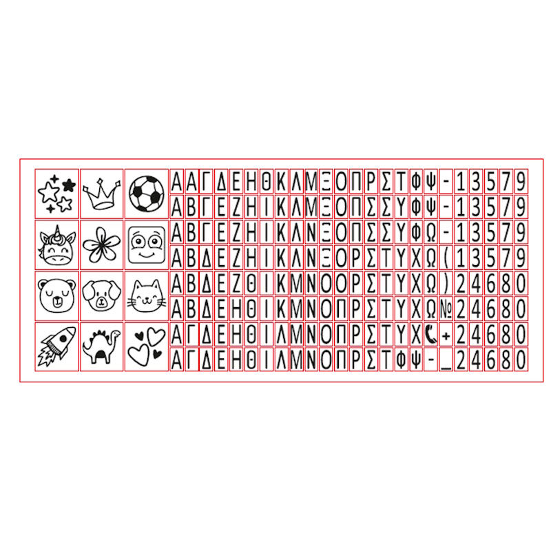 Σφραγίδα εξατομίκευσης προσωπικών αντικειμένων με ελληνικό αλφάβητο!Σταμπάρετε τα ονόματα των παιδιών σας πάνω σε απορροφητικές ή μη απορροφητικές επιφάνειες όπως ρούχα παπούτσια, σχολικά, αθλητικό εξοπλισμό, μπουκάλια, τάπερ και άλλα.