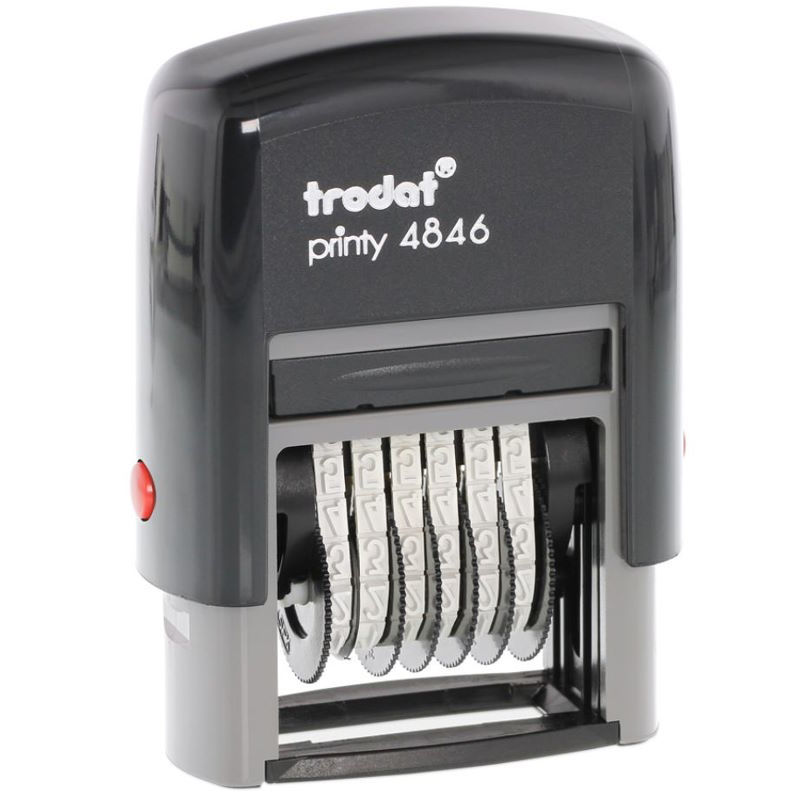 Trodat Printy 4846 με μαύρο μελάνι και 6 αριθμούς και ύψος ψηφίου 4mm. Το μήκος του σφραγίσματος όταν χρησιμοποιηθούν και οι 6 αριθμοί είναι 3.0cm. Ιδανικός μηχανισμός για συνεχόμενη σφράγιση προϊόντων ή εγγράφων με το ίδιο νούμερο. Πμπορεί να χρησιμοποιηθεί με άχρωμο ταμπόν και ανεξίτηλο μελάνι και να σφραγίσει σε οποιαδήποτε επιφάνεια δεν μπορεί να στεγνώσει το απλό μελάνι.