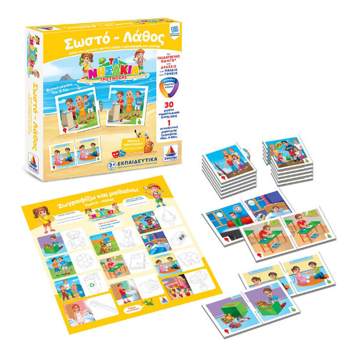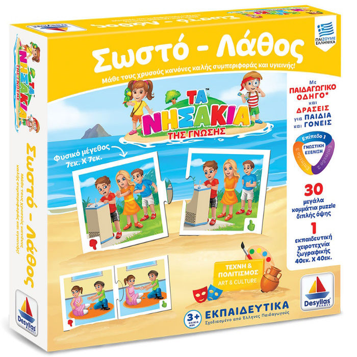 ίναι σωστό να σπρώχνεις στη σειρά; Μήπως είναι ωραίο να δίνεις τη θέση σου σε κάποιον ηλικιωµένο; Πριν καθήσεις για φαγητό, πρέπει να πλύνεις τα χέρια σου; Γνώρισε τους κανόνες καλής συµπεριφοράς και υγιεινής ενώνοντας τα κοµµάτια µεταξύ τους.ΤΑ ΝΗΣΑΚΙΑ ΤΗΣ ΓΝΩΣΗΣ™ είναι µια µοναδική εκπαιδευτική σειρά παιχνιδιών προσχολικής ηλικίας, µε την οποία η κατάκτηση της γνώσης γίνεται πιο διασκεδαστική από ποτέ! Οι θεµατικές ενότητες, οι στόχοι και οι δράσεις έχουν σχεδιαστεί σε συνεργασία µε Έλληνες παιδαγωγούς, σύµφωνα µε το αναλυτικό Πρόγραµµα Σπουδών του Υπουργείου Παιδείας.Ο Παιδαγωγικός Οδηγός που περιέχεται σε κάθε παιχνίδι, είναι αποτέλεσµα χρόνιας επιστηµονικής και παιδαγωγικής έρευνας και ανάπτυξης της εταιρείας µας. Περιλαµβάνει δράσεις βασισµένες στις πιο σύγχρονες θεωρίες µάθησης, τις οποίες ακολουθώντας οι γονείς βήµα-βήµα µεγιστοποιούν το παιδαγωγικό όφελος του παιχνιδιού για το παιδί. Ο Παιδαγωγικός Οδηγός περιέχει επίσης δράσεις που βοηθούν παιδιά µε µαθησιακές δυσκολίες.
