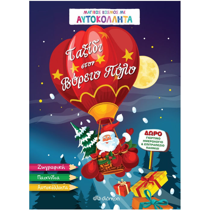 Ένα μαγευτικό ταξίδι ξεκινά εκεί όπου ο ουρανός γεμίζει άστρα και το χιόνι λάμπει σαν σκόνη μαγείας. Στο «Ταξίδι στον Βόρειο Πόλο» τα παιδιά εξερευνούν τον κόσμο του Άη Βασίλη, των ξωτικών και των φανταστικών ζώων, ζώντας τη χαρά των Χριστουγέννων μέσα από δραστηριότητες και πολύχρωμα αυτοκόλλητα.