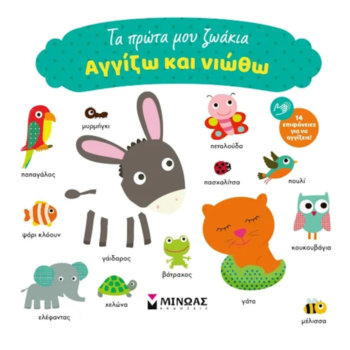 Οι εκδόσεις Μίνωας φέρνουν στα ελληνικά το βιβλίο της Virginie Graire με σκληρόδετη κατασκευή και ανθεκτικές σελίδες ειδικά σχεδιασμένες για μικρά χεράκια. Το βιβλίο ανήκει στη σειρά Αγγίζω και νιώθω και βοηθά τα παιδιά να μάθουν τις πρώτες τους λέξεις για τα ζωάκια μέσα από την επανάληψη και τον συνδυασμό εικόνας αφής και ήχου της φωνής του γονιού.