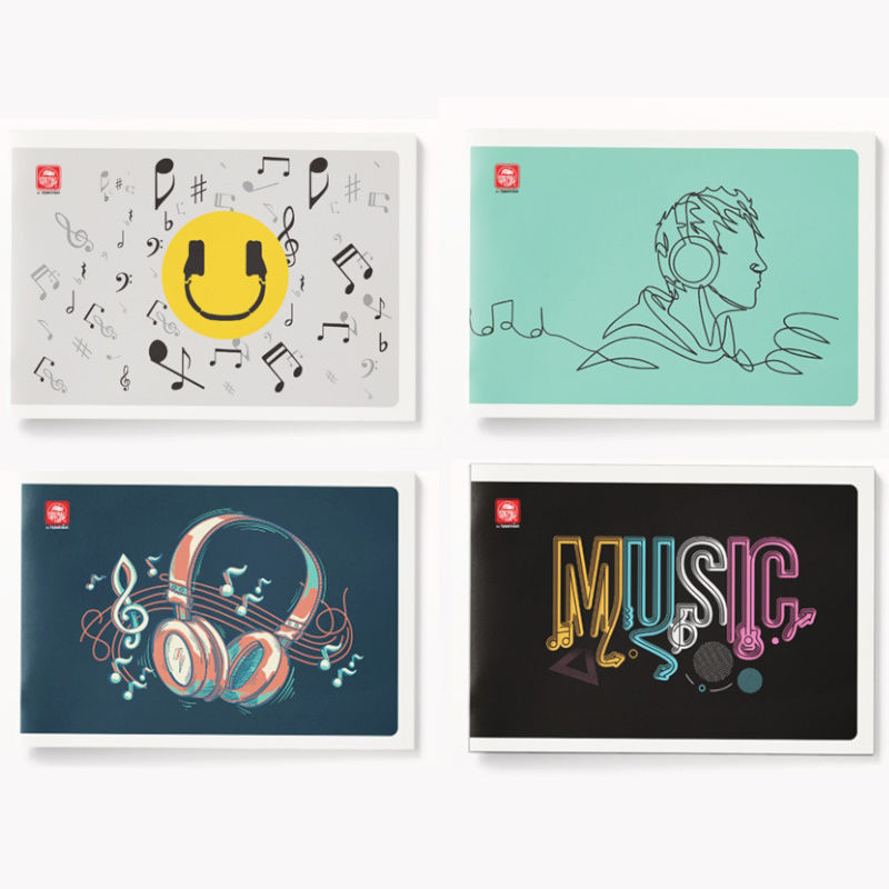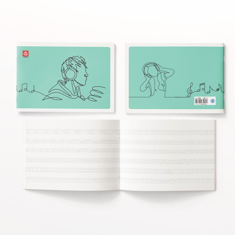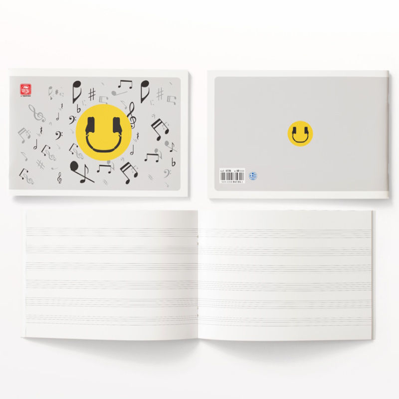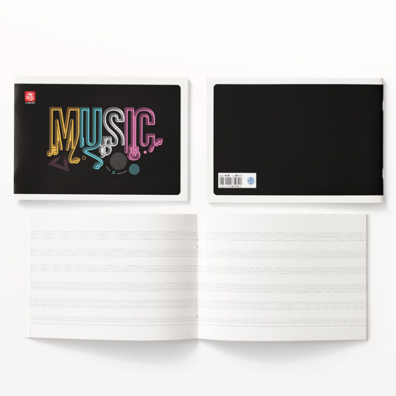Τετράδιo μουσικής με σχέδια. Εξώφυλλο χάρτινο πλαστικοποιημένο. Διάσταση 17x25 πλάγιo, καρφίτσα, 40 φύλλων, με 70gr χαρτί. Η συσκευασία είναι ανάμεικτων σχεδίων σε πακέτο των 12τεμ. Η γραμμογράφηση είναι 6 Πενταγράμμων. Απαραίτητο για όποιον ασχολείται με τη μουσική!