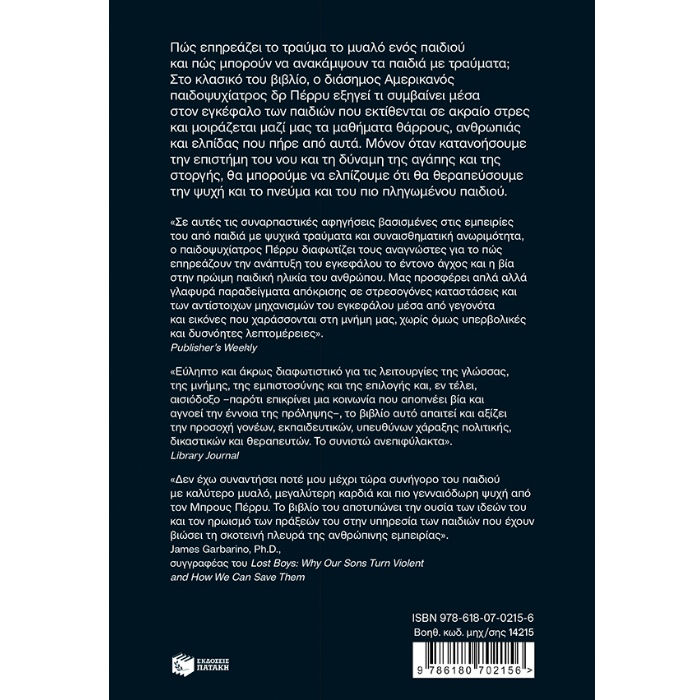 Πώς επηρεάζει το τραύμα το μυαλό ενός παιδιού και πώς μπορούν να ανακάμψουν τα παιδιά με τραύματα; Στο κλασικό του βιβλίο, ο διάσημος Αμερικανός παιδοψυχίατρος δρ Πέρρυ εξηγεί τι συμβαίνει μέσα στον εγκέφαλο των παιδιών που εκτίθενται σε ακραίο στρες και μοιράζεται μαζί μας τα μαθήματα θάρρους, ανθρωπιάς και ελπίδας που πήρε από αυτά. Μόνον όταν κατανοήσουμε την επιστήμη του νου και τη δύναμη της αγάπης και της στοργής, θα μπορούμε να ελπίζουμε ότι θα θεραπεύσουμε την ψυχή και το πνεύμα και του πιο πληγωμένου παιδιού.