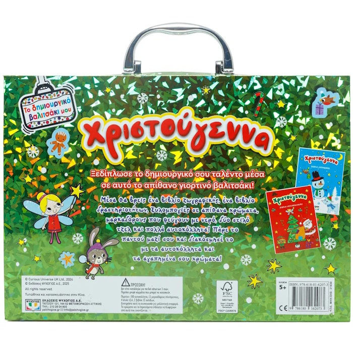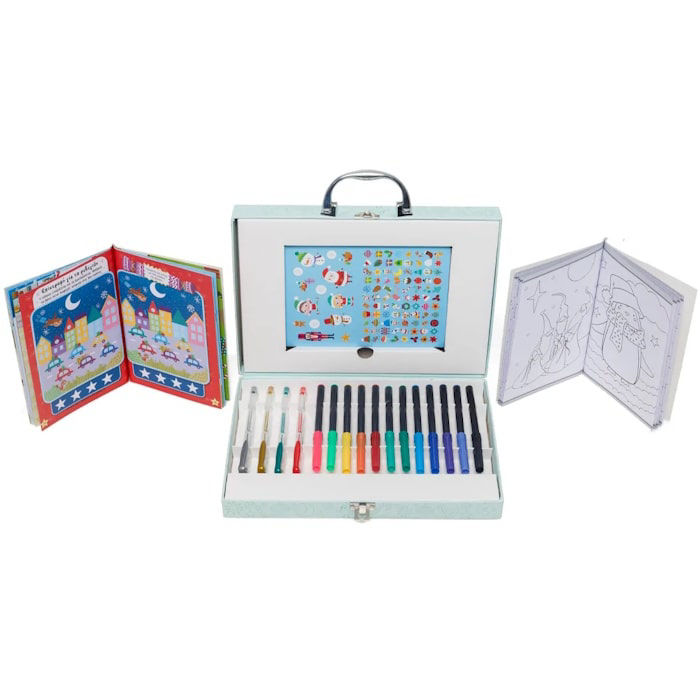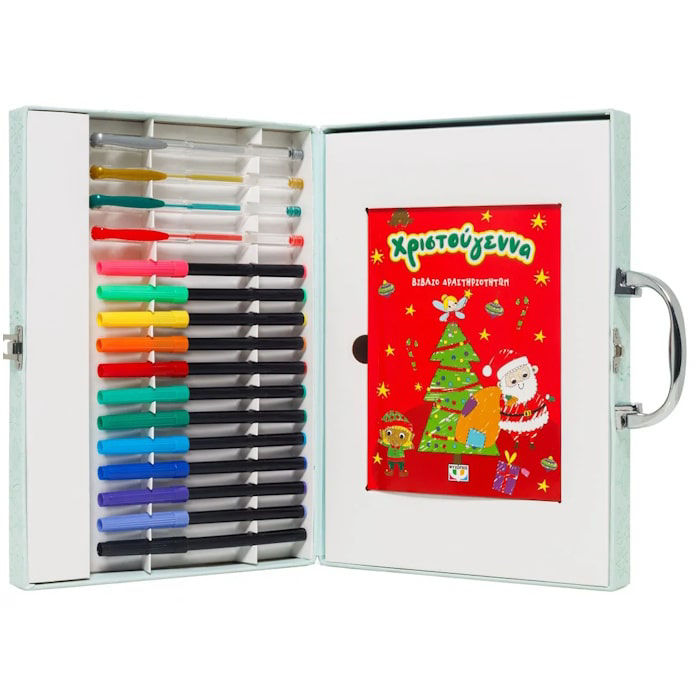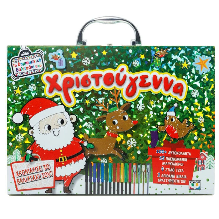 Μέσα στο βαλιτσάκι υπάρχουν βιβλία ζωγραφικής και δραστηριοτήτων, ξυλομπογιές με έντονα χρώματα, μαρκαδόροι που καθαρίζουν εύκολα με νερό, στιλό τζελ και πολλά αυτοκόλλητα. Η ποικιλία υλικών δίνει στα παιδιά την ελευθερία να εκφραστούν, να στολίσουν, να δοκιμάσουν τεχνικές και να δημιουργήσουν δικά τους έργα μέσα στο πνεύμα των Χριστουγέννων.