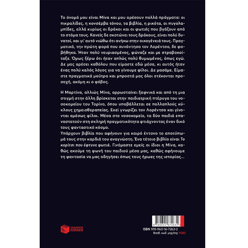 Το όνομά μου είναι Μίνα και μου αρέσουν πολλά πράγματα: οι πικραλίδες, η κονσέρβα τόνου, τα βιβλία, η ρικότα, οι πυγολαμπίδες, αλλά κυρίως οι δράκοι και οι φωτιές που βγάζουν από το στόμα τους. Κανείς δε σκοτώνει τους δράκους, είναι πολύ δυνατοί, και γι’ αυτό νιώθω ότι ανήκω στην οικογένειά τους. Πραγματικά, την πρώτη φορά που συνάντησα τον Λορέντσο, δε φοβήθηκα. Ήταν πολύ νευριασμένος, φώναζε και με στραβοκοίταξε. Όμως ξέρω ότι ήταν απλώς πολύ θυμωμένος, όπως εγώ. Δε μας αρέσει καθόλου που είμαστε εδώ μέσα, κι αυτός ήταν ένας πολύ καλός λόγος για να γίνουμε φίλοι. Δε μασάμε. Είμαστε πραγματικά μούτρα και μπροστά μας όλοι στέκονται προσοχή, ακόμη κι ο φόβος.