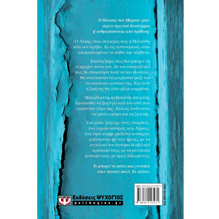Ένα μπλε ζαφείρι, ένας σκορπιός, ένα γεράκι-κυνηγός κι η Λήμνος, ένα νησί πλημμυρισμένο μυστήριο, μπλέκονται με τους ήρωες, με το αγγελικό και συνάμα διαβολικό πρόσωπό τους, με τα ανείπωτα μυστικά τους, με τρεις δολοφονίες.