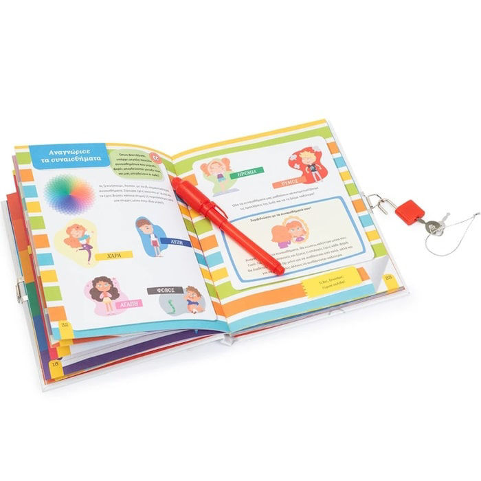 Ανακάλυψε τον κόσμο των συναισθημάτων μέσα από αυτό το υπέροχο μυστικό ημερολόγιο. Παίξε και πειραματίσου με απίθανες δημιουργικές δραστηριότητες! Μάθε τα πάντα για τα συναισθήματα. Είναι τόσο συναρπαστικό! Τα συναισθήματα είναι πολύτιμα! Αναγνώρισε τόσο τα δικά σου όσο και των άλλων. Περίγραψε τα συναισθήματά σου ή ζωγράφισέ τα… με αόρατο μελάνι!
