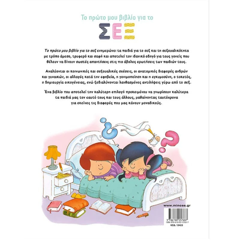 Ένα προσεγμένο και ειλικρινές βιβλίο που βοηθά τα παιδιά να γνωρίσουν τον εαυτό τους και να κατανοήσουν τη σεξουαλικότητα με απλό, επιστημονικά ορθό και τρυφερό τρόπο. Μέσα από καθαρή γλώσσα και εικονογράφηση κατάλληλη για την ηλικία τους, εξηγούνται θέματα όπως η διαφορά ανάμεσα στα δύο φύλα, οι αλλαγές της εφηβείας, η γονιμοποίηση, η εγκυμοσύνη, η γέννηση και οι σχέσεις μεταξύ ανθρώπων.