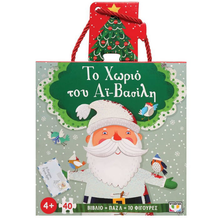 Ανακαλύψτε μέσα στο κουτί ένα βιβλιαράκι με πολλές γιορτινές εικόνες και μάθετε να τις συσχετίζετε, παρέα με τον Αϊ-Βασίλη, με τα σχήματα, τα χρώματα, τους αριθμούς και με πολλές λεξούλες. Στη συνέχεια συναρμολογήστε το παζλ και τοποθετήστε επάνω τις 10 φιγούρες από το χωριό του Αϊ-Βασίλη ή παίξτε χωριστά με αυτές!