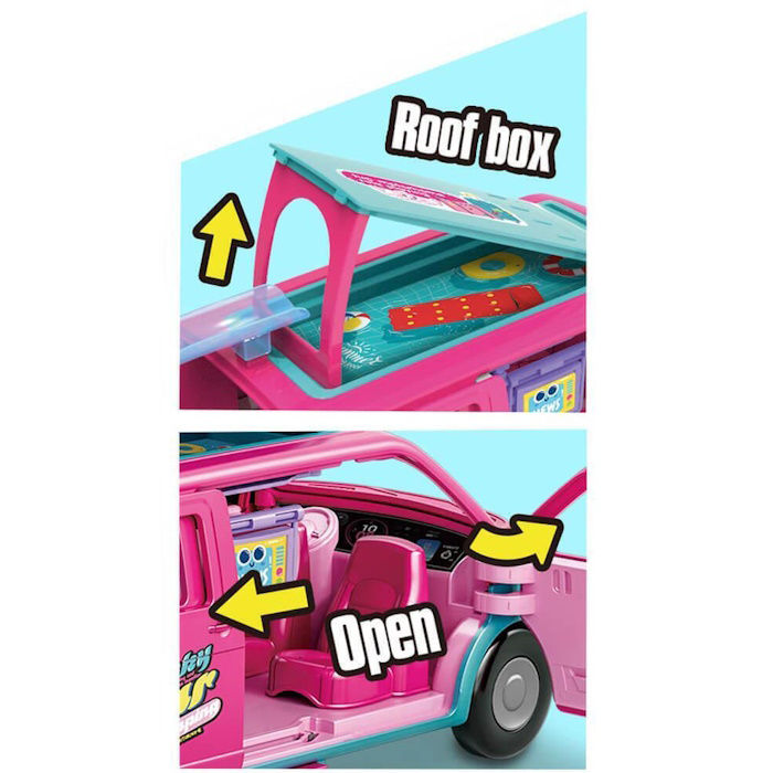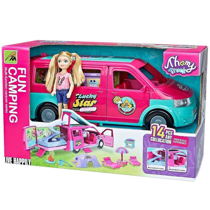 Το τροχόσπιτο διαθέτει πόρτες που ανοίγουν, πλήρως εξοπλισμένο εσωτερικό με μικρά έπιπλα και αξεσουάρ, ενώ η κούκλα που περιλαμβάνεται προσθέτει μια επιπλέον δόση ζωντάνιας και φαντασίας. Τα παιδιά μπορούν να φανταστούν ταξίδια, πικ-νικ ή διακοπές, αναπτύσσοντας τη δημιουργικότητά τους και μαθαίνοντας μέσα από το παιχνίδι τη χαρά της ανεξαρτησίας και της περιπέτειας.
