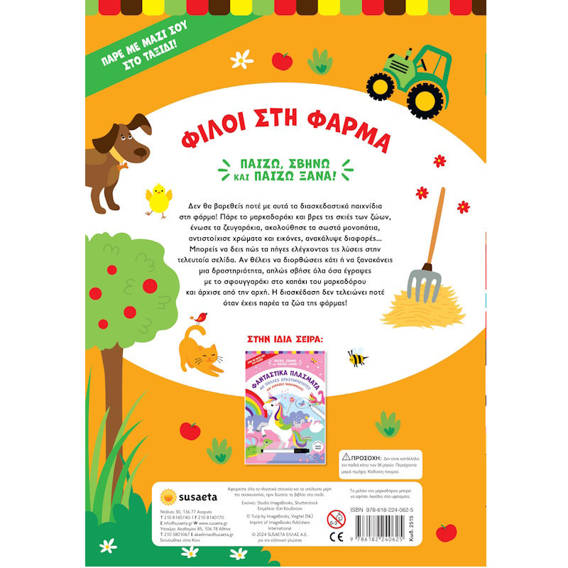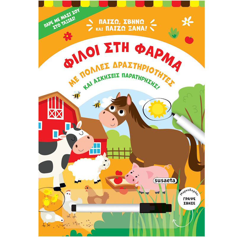 Δεν θα βαρεθείς ποτέ με αυτά τα διασκεδαστικά παιχνίδια στη φάρμα! Πάρε το μαρκαδοράκι και βρες τις σκιές των ζώων, ένωσε τα ζευγαράκια, ακολούθησε τα σωστά μονοπάτια, αντιστοίχισε χρώματα και εικόνες, ανακάλυψε διαφορές… Μπορείς να δεις πώς τα πήγες ελέγχοντας τις λύσεις στην τελευταία σελίδα. Αν θέλεις να διορθώσεις κάτι ή να ξανακάνεις μια δραστηριότητα, απλώς σβήσε όλα όσα έγραψες με το σφουγγαράκι στο καπάκι του μαρκαδόρου και άρχισε από την αρχή. Η διασκέδαση δεν τελειώνει ποτέ όταν έχεις παρέα τα ζώα της φάρμας!