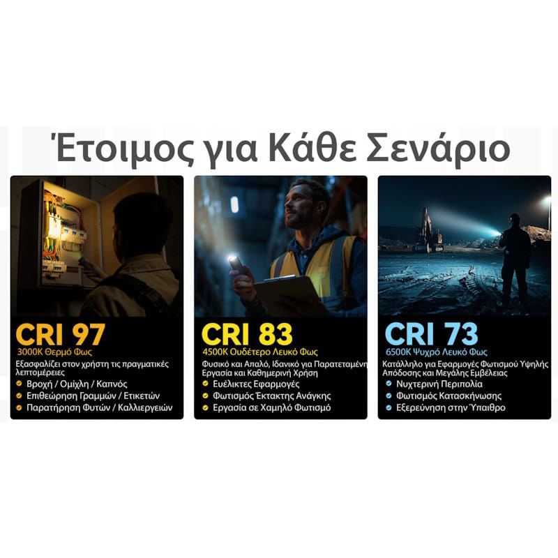 - Θερμοκρασίες φωτισμού: 3000K warm light CRI 97, 4500K neutral white light CRI 83, 6500K cool white light CRI 73