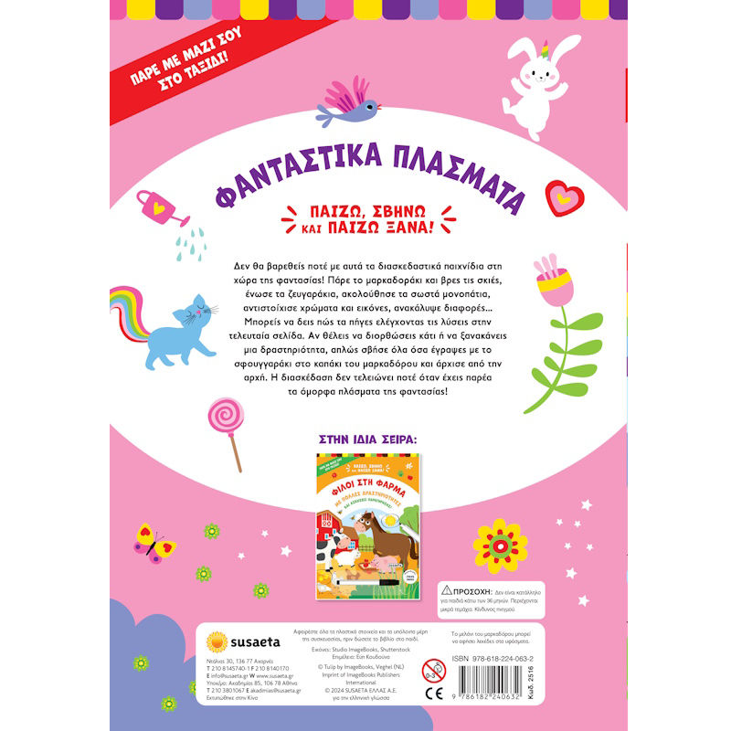 Δεν θα βαρεθείς ποτέ με αυτά τα διασκεδαστικά παιχνίδια στη χώρα της φαντασίας! Πάρε το μαρκαδοράκι και βρες τις σκιές, ένωσε τα ζευγαράκια, ακολούθησε τα σωστά μονοπάτια, αντιστοίχισε χρώματα και εικόνες, ανακάλυψε διαφορές… Μπορείς να δεις πώς τα πήγες ελέγχοντας τις λύσεις στην τελευταία σελίδα. Αν θέλεις να διορθώσεις κάτι ή να ξανακάνεις μια δραστηριότητα, απλώς σβήσε όλα όσα έγραψες με το σφουγγαράκι στο καπάκι του μαρκαδόρου και άρχισε από την αρχή. Η διασκέδαση δεν τελειώνει ποτέ όταν έχεις παρέα τα όμορφα πλάσματα της φαντασίας!