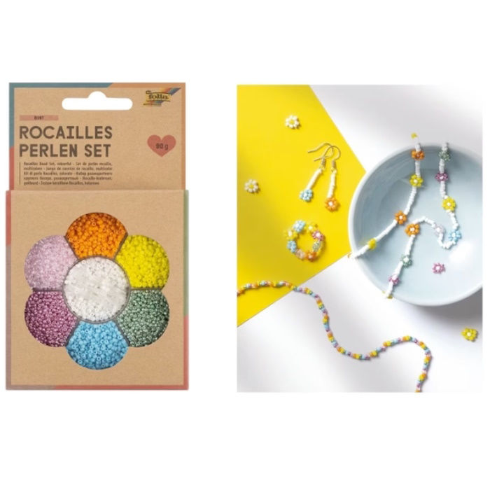 Sετ με χάντρες Rocailles περιέχει όλα όσα χρειάζεστε για σπιτικά κοσμήματα: 90g χάντρες σε 7 διαφορετικά χρώματα, 3 x 1 μέτρο νάιλον κλωστή και 3 δαχτυλίδια και κουμπώματα το καθένα. Ιδανικό για κολιέ, βραχιόλια και πολλά άλλα.