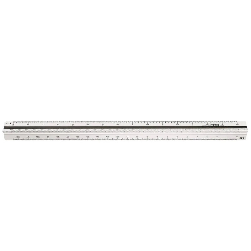 Πλαστικός χάρακας, κλιμακόμετρο. Ανάγλυφη εκτύπωση με μαύρα γράμματα.Οι κλίμακες 1:100, 1:25, 1:20, 1:75, 1:50, 1:125
