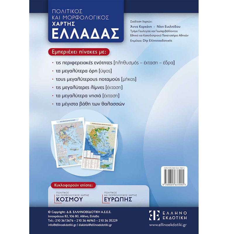 Ο Χάρτης Ελλάδας Πολιτικός και Γεωφυσικός της Ελληνοεκδοτικής (ISBN 9789605637095) αποτελεί απαραίτητο βοήθημα για σχολεία, φροντιστήρια και μαθητές. Στις διαστάσεις 70x100cm, αποτυπώνει με ακρίβεια τα πολιτικά όρια, τις περιφέρειες και τις πρωτεύουσες, ενώ παράλληλα αναδεικνύει τα βασικά γεωφυσικά χαρακτηριστικά, όπως βουνά, ποτάμια και ακτογραμμές.