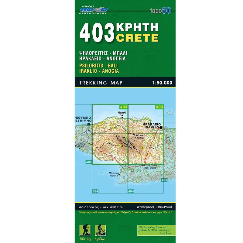 Ανακάλυψε την ορεινή καρδιά της Κρήτης και τις παραθαλάσσιες ομορφιές του Μπαλί με τον τοπογραφικό χάρτη Ψηλορείτης – Μπαλί σε κλίμακα 1:50.000 από τις εκδόσεις Road. Ιδανικός για πεζοπορία, ορειβασία, ποδηλασία ή και απλές εκδρομές με αυτοκίνητο, ο χάρτης προσφέρει λεπτομερή αποτύπωση του ανάγλυφου, των μονοπατιών, των δασικών δρόμων, των φαραγγιών και των χωριών.