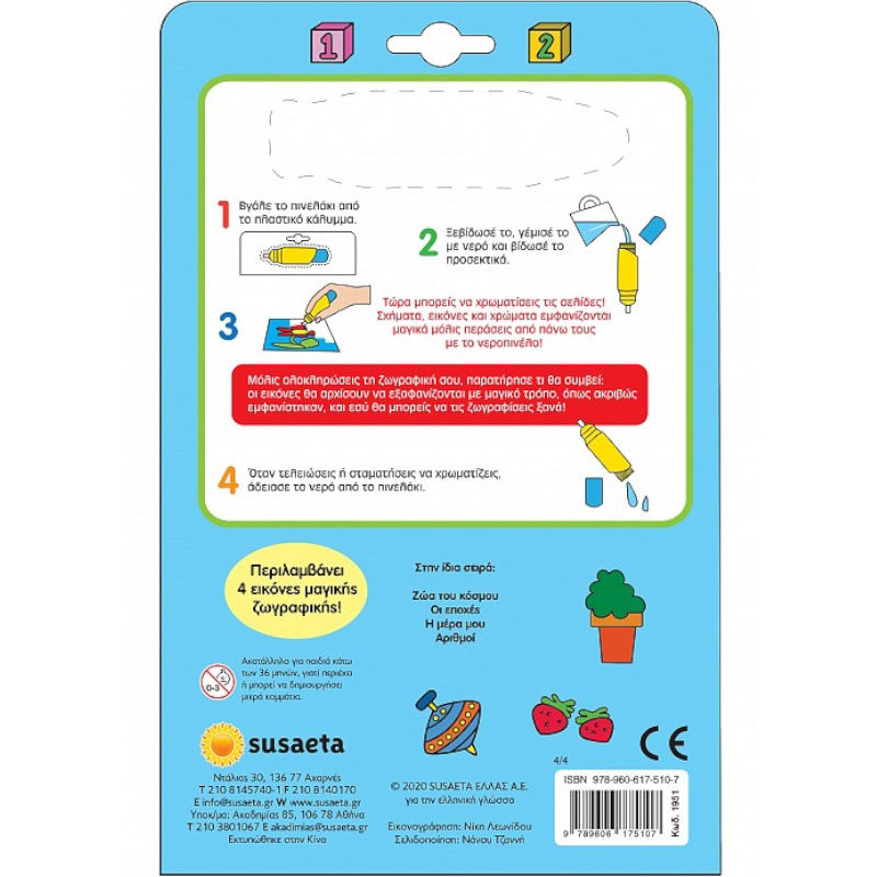Γέμισε το μαγικό πινέλο με νερό και δες τις εικόνες των βιβλίων να μεταμορφώνονται στις πιο πολύχρωμες και χαρούμενες ζωγραφιές. Άφησέ τες να στεγνώσουν για να τις χρωματίσεις ξανά και ξανά!