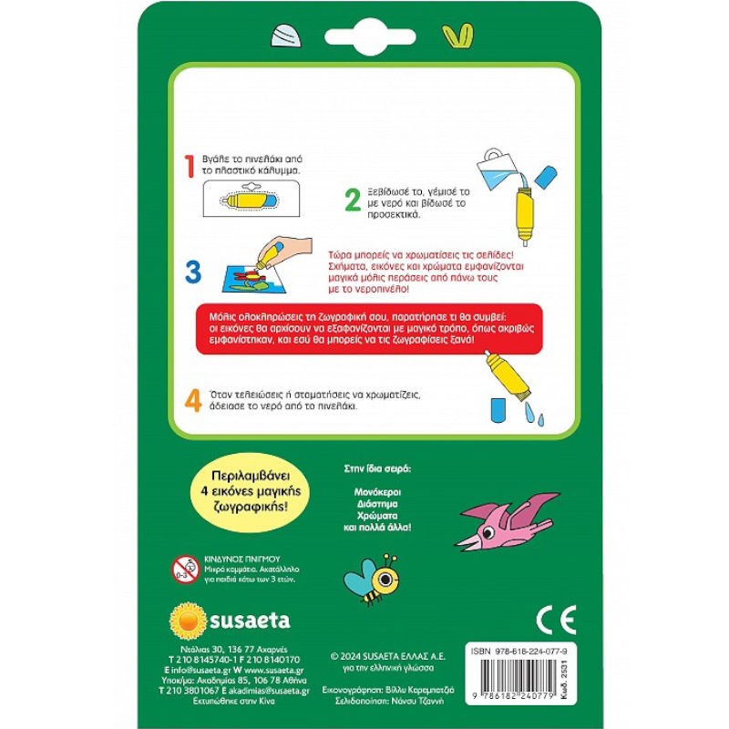 Γέμισε το μαγικό πινέλο με νερό και δες τις εικόνες του βιβλίου να μεταμορφώνονται στις πιο πολύχρωμες και χαρούμενες ζωγραφιές. Άφησέ τες να στεγνώσουν για να τις χρωματίσεις ξανά και ξανά!