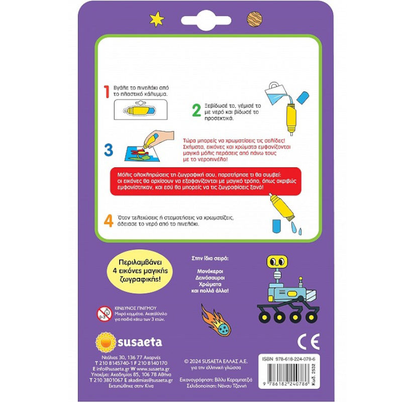 Γέμισε το μαγικό πινέλο με νερό και δες τις εικόνες του βιβλίου να μεταμορφώνονται στις πιο πολύχρωμες και χαρούμενες ζωγραφιές. Άφησέ τες να στεγνώσουν για να τις χρωματίσεις ξανά και ξανά!