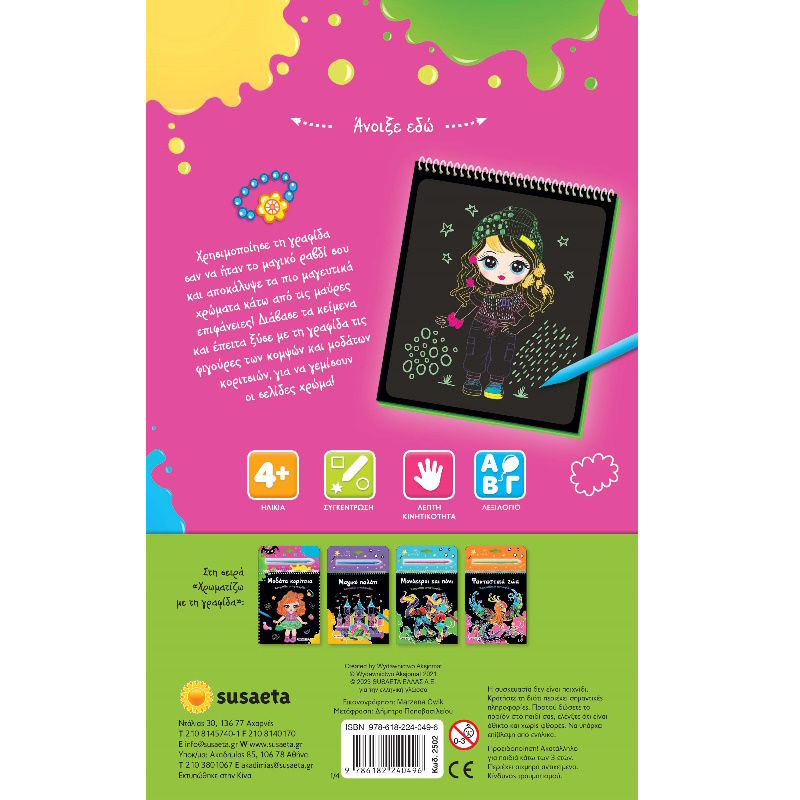 Χρησιμοποίησε τη γραφίδα σαν να ήταν το μαγικό ραβδί σου και αποκάλυψε τα πιο μαγευτικά χρώματα κάτω από τις μαύρες επιφάνειες! Διάβασε τα κείμενα και έπειτα ξύσε με τη γραφίδα τις φιγούρες των κομψών και μοδάτων κοριτσιών, για να γεμίσουν οι σελίδες χρώμα!