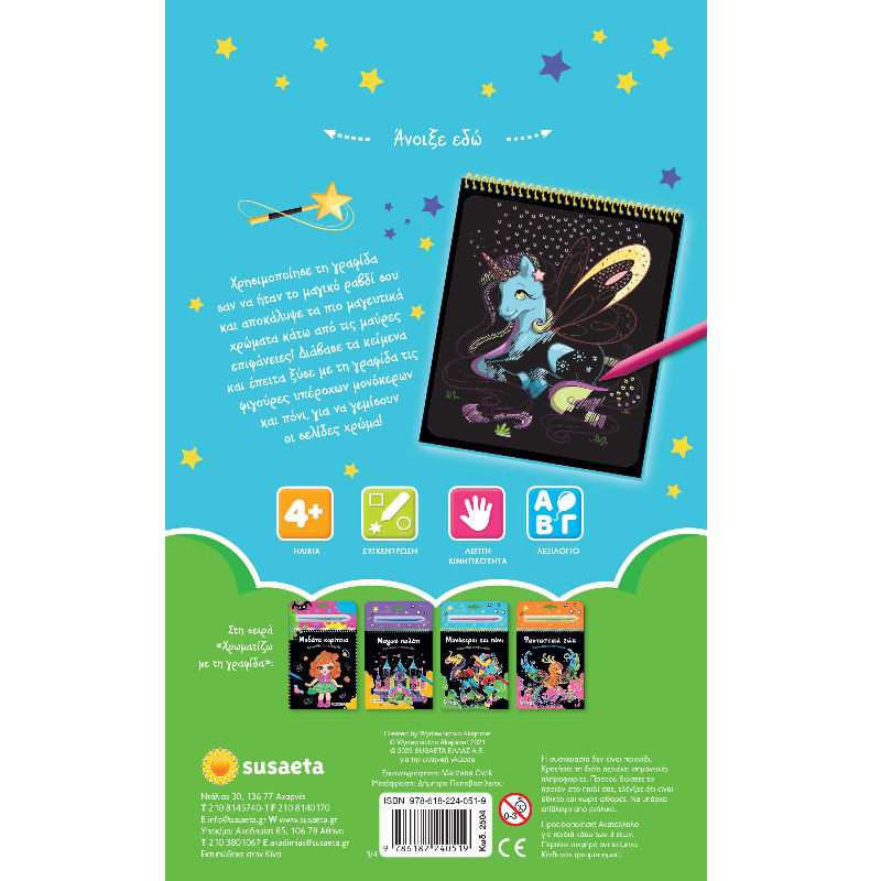 Χρησιμοποίησε τη γραφίδα σαν να ήταν το μαγικό ραβδί σου και αποκάλυψε τα πιο μαγευτικά χρώματα κάτω από τις μαύρες επιφάνειες! Διάβασε τα κείμενα και έπειτα ξύσε με τη γραφίδα τις φιγούρες υπέροχων μονόκερων και πόνι, για να γεμίσουν οι σελίδες χρώμα!