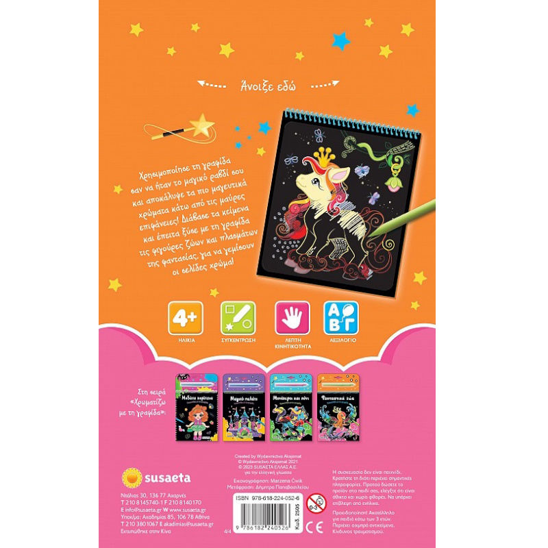 Χρησιμοποίησε τη γραφίδα σαν να ήταν το μαγικό ραβδί σου και αποκάλυψε τα πιο μαγευτικά χρώματα κάτω από τις μαύρες επιφάνειες! Διάβασε τα κείμενα και έπειτα ξύσε με τη γραφίδα τις φιγούρες των κομψών και μοδάτων κοριτσιών, για να γεμίσουν οι σελίδες χρώμα!