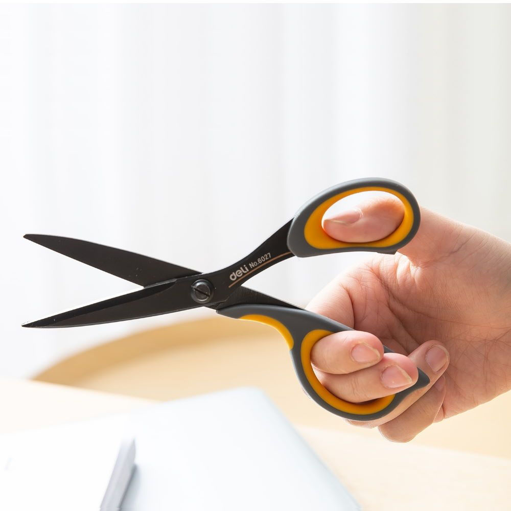 Ψάλιδι από την Deli με εργονομική λαβή και λεπίδα κόβει εύκολα χαρτί και χαρτόνι.
