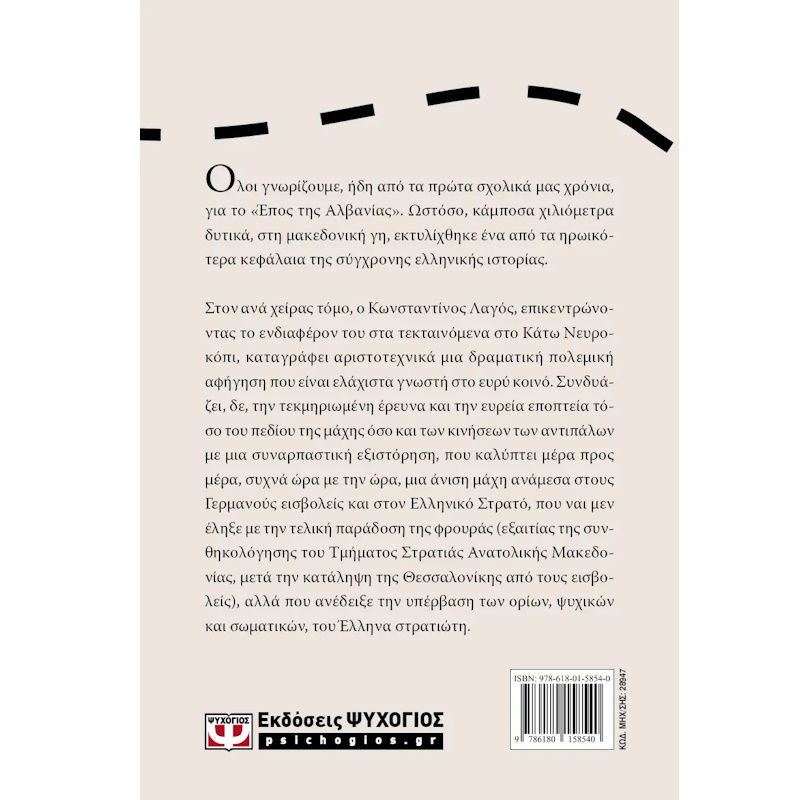 Στον ανά χείρος τόμο, ο Κωνσταντίνος Λαγός, επικεντρώνοντας το ενδιαφέρον του στα τεκταινόμενα στο Κάτω Νευροκόπι, καταγράφει αριστοτεχνικά μια δραματική πολεμική αφήγηση που είναι ελάχιστα γνωστή στο ευρύ κοινό. Συνδυάζει, δε, την τεκμηριωμένη έρευνα και την ευρεία εποπτεία, τόσο του πεδίου της μάχης όσο και των κινήσεων των αντιπάλων, με μια συναρπαστική εξιστόρηση, που καλύπτει μέρα προς μέρα, συχνά ώρα με την ώρα, μια άνιση μάχη ανάμεσα στους Γερμανούς εισβολείς και στον Ελληνικό Στρατό, που ναι μεν έληξε με την τελική παράδοση της φρουράς (εξαιτίας της συνθηκολόγησης του Τμήματος Στρατιάς Ανατολικής Μακεδονίας, μετά την κατάληψη της Θεσσαλονίκης από τους εισβολείς), αλλά που ανέδειξε την υπέρβαση των ορίων, ψυχικών και σωματικών, του Έλληνα στρατιώτη