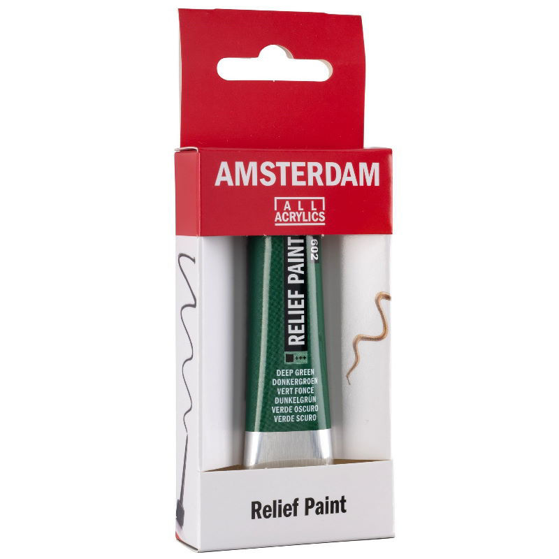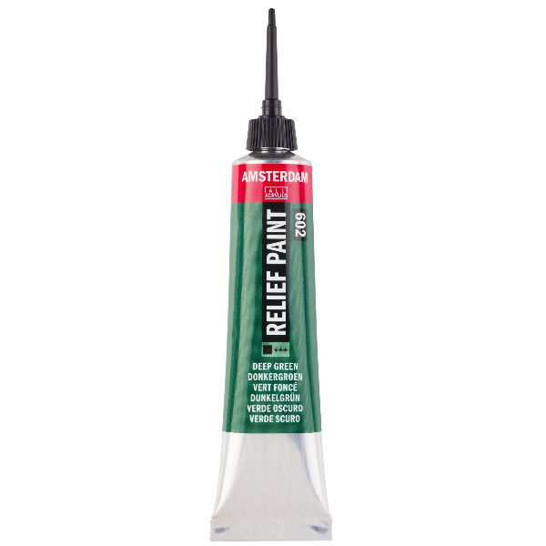 Η ανάγλυφη βαφή Amsterdam σε βαθύ πράσινο (602) είναι ένα αδιαφανές χρώμα με εξαιρετική αντοχή στο φως (+++).