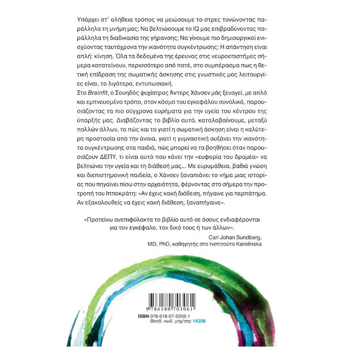 Στο Brainfit, ο Σουηδός ψυχίατρος Άντερς Χάνσεν μάς ξεναγεί, με απλό και εμπνευσμένο τρόπο, στον κόσμο του εγκεφάλου συνολικά, παρουσιάζοντας τα πιο σύγχρονα ευρήματα για την υγεία του κέντρου της ύπαρξής μας. Διαβάζοντας το βιβλίο αυτό, καταλαβαίνουμε, μεταξύ πολλών άλλων, το πώς και το γιατί η σωματική άσκηση είναι η καλύτερη προστασία από την άνοια, γιατί η γυμναστική αυξάνει την ικανότητα συγκέντρωσης στα παιδιά, πώς μπορεί να τα βοηθήσει όταν παρουσιάζουν ΔΕΠΥ, τι είναι αυτό που κάνει την «ευφορία του δρομέα» να βελτιώνει την υγεία και τη διάθεσή μας... Με ευρυμάθεια, βαθιά γνώση και διεπιστημονική παιδεία, ο Xάνσεν ξαναπιάνει το νήμα μιας ιστορίας που πηγαίνει πίσω στην αρχαιότητα, φέρνοντας στο σήμερα την προτροπή του Ιπποκράτη: «Αν έχεις κακή διάθεση, πήγαινε για περπάτημα. Αν εξακολουθείς να έχεις κακή διάθεση, ξαναπήγαινε».