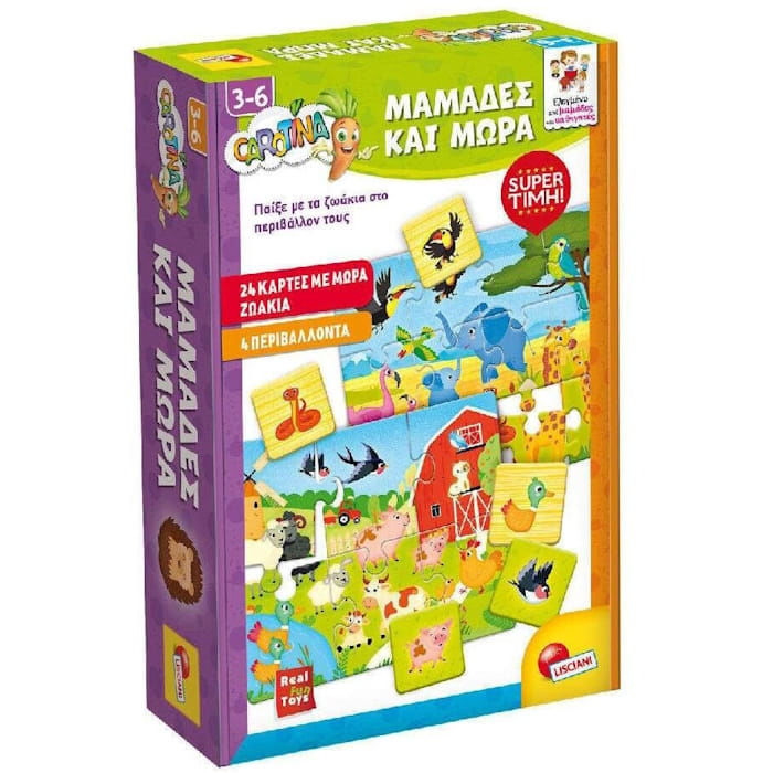 Το εκπαιδευτικό παιχνίδι Carotina Μαμάδες και μωρά της Lisciani είναι ένα παιχνίδι αντιστοίχισης ειδικά σχεδιασμένο για παιδιά πολύ μικρής ηλικίας. Μέσα από την απλή και κατανοητή διαδικασία της ένωσης δύο κομματιών, το παιδί ανακαλύπτει τη σχέση μεταξύ της μητέρας και του μικρού της στο ζωικό βασίλειο, αναπτύσσοντας παράλληλα τη λογική του σκέψη και την παρατηρητικότητα.