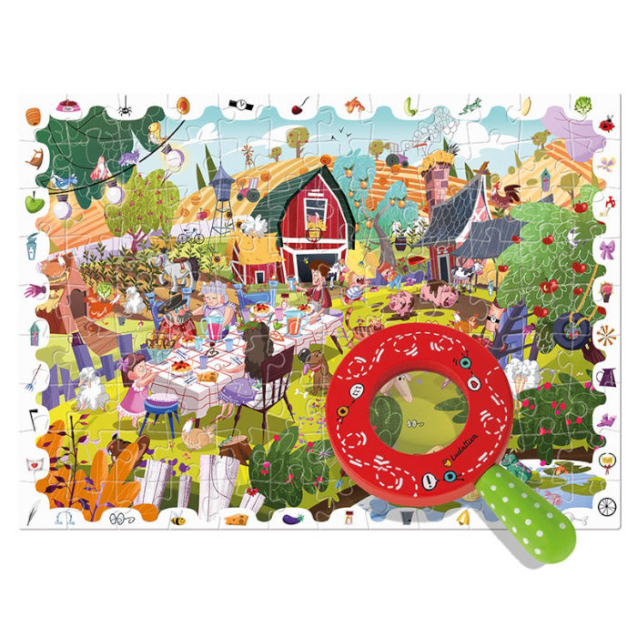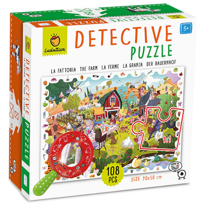 Παζλ εξαιρετικής ποιότητας, 108 κομματιών με θέμα «Η Φάρμα». Συνθέστε το παζλ και μεταμορφωθείτε σε έναν μικρό ντετέκτιβ, χρησιμοποιώντας τον ξύλινο μεγεθυντικό φακό για να βρείτε μέσα στην εικόνα όλα τα αντικείμενα που βρίσκονται στο πλαίσιο του παζλ . Ένα παιχνίδι που εξάπτει την περιέργεια και αναπτύσσει την παρατηρητικότητα των παιδιών.