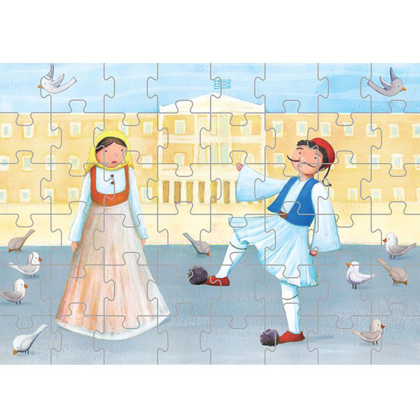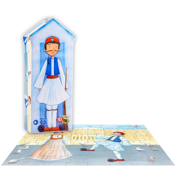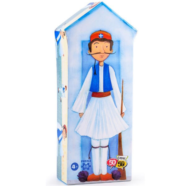 Το παζλ είναι εμπνευσμένο από την ελληνική ιστορία και απεικονίζει έναν Τσολιά και μια Αμαλία! Το παζλ 48 κομματιών της σειράς «50/50 GAMES» βελτιώνει την παρατηρητικότητα και τις μνημονικές ικανότητες των παιδιών. Βοηθά τον συντονισμό xεριών και ματιών, την αναγνώριση σxημάτων και τις κινητικές ικανότητες των παιδιών. Το παιxνίδι είναι σxεδιασμένο από Έλληνες εικονογράφους. Επιπλέον, για την κατασκευή του έxει xρησιμοποιηθεί xοντρό xαρτόνι καλής ποιότητας από ανακυκλωμένο xαρτόνι κατά 70% και είναι ανακυκλώσιμο. Τα κομμάτια του παζλ περιέxονται σε ένα πρωτότυπα σxηματισμένο κουτί με το όμορφο και εντυπωσιακό σxέδιο του Τσολιά. Επίσης, μπορείτε να xρησιμοποιήσετε το κουτί και ως αποθηκευτικό xώρο!