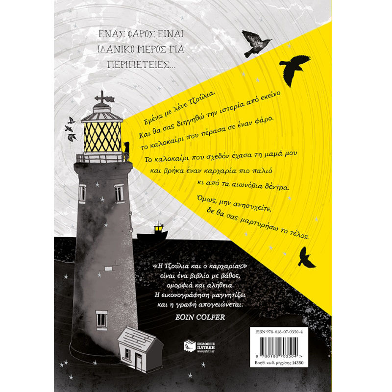 Εμένα με λένε Τζούλια. Και θα σας διηγηθώ την ιστορία από εκείνο το καλοκαίρι που πέρασα σε έναν φάρο. Το καλοκαίρι που σχεδόν έχασα τη μαμά μου και βρήκα έναν καρχαρία πιο παλιό κι από τα αιωνόβια δέντρα. Όμως, μην ανησυχείτε, δε θα σας μαρτυρήσω το τέλος.