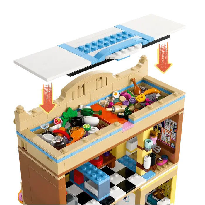 Η κατασκευή είναι πλούσια σε λεπτομέρειες, διαθέτοντας έναν πλήρως εξοπλισμένο χώρο εστίασης στο ισόγειο και μια μοντέρνα σχολή μαγειρικής στον όροφο. Περιλαμβάνει πληθώρα από ρεαλιστικά αξεσουάρ κουζίνας, όπως κατσαρόλες, συστατικά, φούρνους και ταμειακές μηχανές, που κάνουν το παιχνίδι να μοιάζει αληθινό. Οι μίνι φιγούρες της σειράς Friends ζωντανεύουν τον χώρο, επιτρέποντας στα παιδιά να εξερευνήσουν τη δυναμική της ομαδικής εργασίας και της φιλίας μέσα σε ένα επαγγελματικό περιβάλλον.