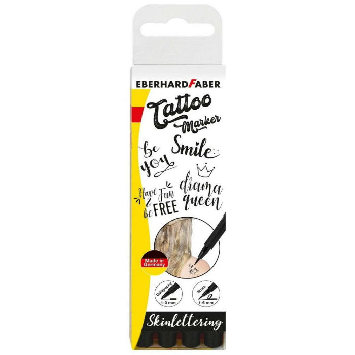 Mαρκαδόροι Eberhard Faber Tattoo δερματολογικά ελεγμένοι από την εταιρεία EBRHARD FABER. Η συσκευασία περιέχει τέσσερα τεμάχια με μελάνι μαύρο. Τα δύο έχουν μύτη 1-3mm πλακέ και τα υπόλοιπα δύο έχουν μύτη πινέλο, για καλλιγραφία, με πλάτος γραφής 1-6mm.