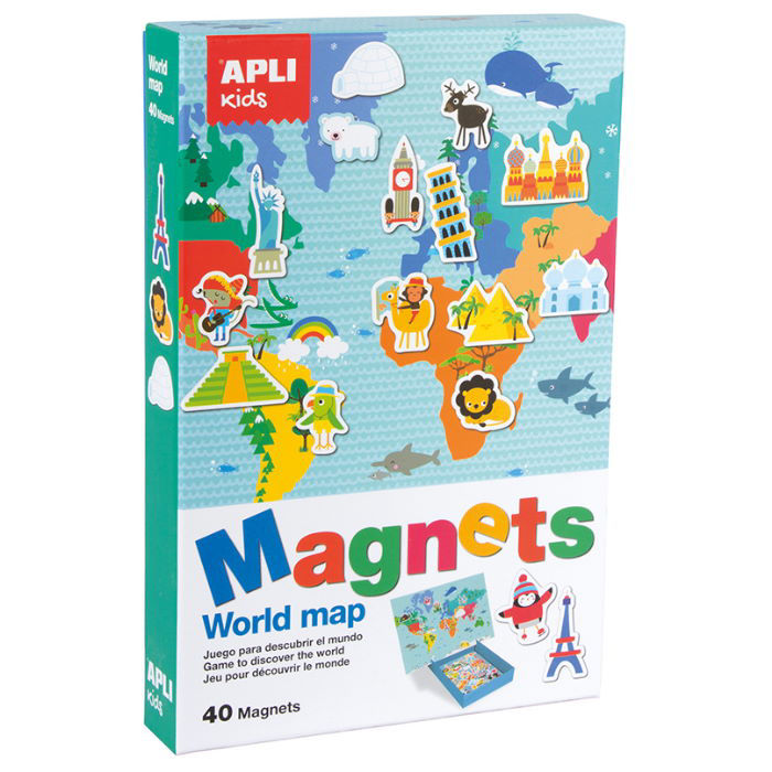 Μαγνητικός παγκόσμιος χάρτης, για τα μικρά να μάθουν να τοποθετούν πολλά μνημεία και ζώα στον χάρτη. Κάθε σετ περιλαμβάνει: 1 ξεδιπλωμένο μαγνητικό στάδιο διαστάσεων 36 x 28 cm για να χωρέσει στη βάση του κουτιού και 40 μετρητές με σχέδια μνημείων και ζώων. Αποκλειστική σχεδίαση APLI Kids με πρωτότυπες και πολύχρωμες εικόνες. Παιχνίδι με υψηλή εκπαιδευτική αξία: ενθαρρύνει την παρατήρηση και τη φαντασία. αυξάνει τη συγκέντρωση και την προσοχή. και δημιουργεί ενδιαφέρον για αντικείμενα, ζώα και χαρακτήρες που δεν γνωρίζουν.