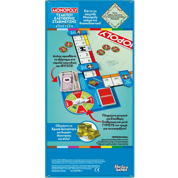 Δοκιμάστε την τύχη σας και μαζέψτε μετρητά! Η επέκταση Monopoly Free Parking Jackpot φέρνει μια νέα πινελιά στο παιχνίδι Monopoly και μειώνει στο μισό τον χρόνο παιχνιδιού. Απλώς προσαρτήστε αυτήν την επέκταση στην κλασική επιφάνεια Monopoly και μετατρέψτε τον χώρο του Free Parking σε ένα Τζακπότ. (Απαιτείται το κλασικό παιχνίδι Monopoly για να παίξετε. Πωλείται ξεχωριστά.) Περιστρέψτε τον τροχό για μια ευκαιρία να κερδίσετε ΜΕΓΑΛΑ χρήματα! Αναβαθμίστε στο Deal Mobile πιόνι και τραβήξτε κάρτες Bonus για να αποκτήσετε δωρεάν ακίνητα και άλλα. Το παιχνίδι τελειώνει όταν όλα τα ακίνητα έχουν αγοραστεί ή όταν ένας παίκτης έχει χρεοκοπήσει. Νικητής είναι ο πλουσιότερος παίκτης! Βγάλτε αυτήν την συναρπαστική επέκταση Monopoly για μια βραδιά παιχνιδιού με την οικογένεια, διακοπές και γρήγορη διασκέδαση. Τα οικογενειακά και παιδικά επιτραπέζια παιχνίδια αποτελούν υπέροχα δώρα για παιδιά.