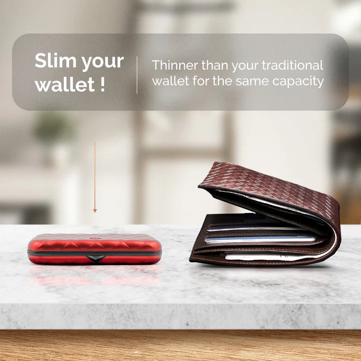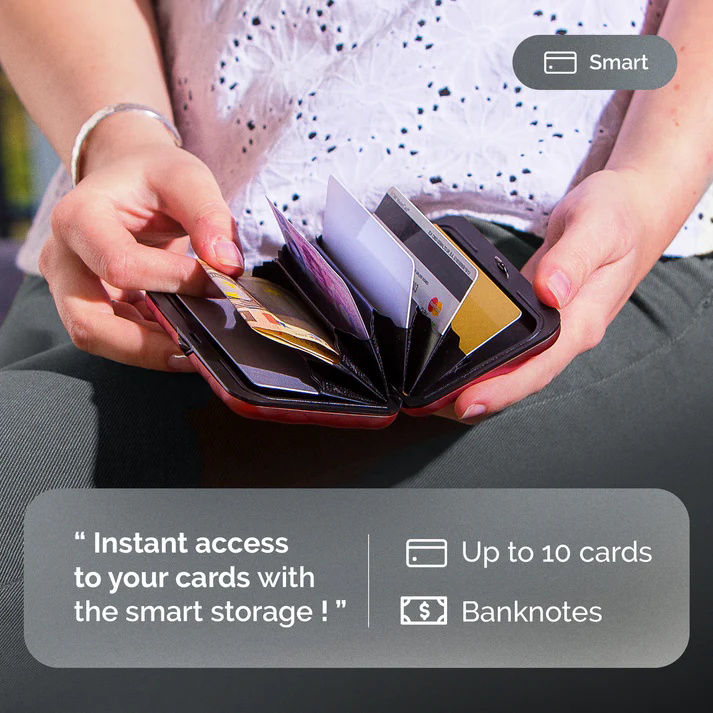 Ιδιότητες: Χωρητικότητα έως δέκα κάρτες και χαρτονομίσματα, προστασία RFID, μηχανισμός μεταλλικού κλεισίματος