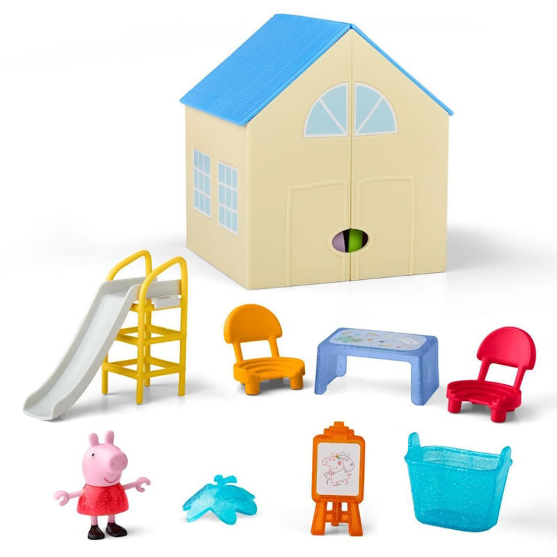 Το σετ παιχνιδιών Peppa's Press and Open είναι έτοιμο για όλες τις ιστορίες νηπιαγωγείου. Τα παιδιά μπορούν να ανοίξουν και να επεκτείνουν το σχολείο για να αποκαλύψουν την αίθουσα διδασκαλίας και τους χώρους παιχνιδιού, και στη συνέχεια να οργανώσουν τα αξεσουάρ όπως επιθυμούν. Κατά τη διάρκεια της ώρας τέχνης, μπορούν να φανταστούν τη φιγούρα της Peppa Pig να χρησιμοποιεί τον καβαλέτο ή να κάθεται σε μια καρέκλα στο τραπέζι της τέχνης. Τι δημιούργησε η Peppa; Μια λαμπερή μάσκα πεταλούδας! Η φιγούρα της Peppa μπορεί πραγματικά να φορέσει το αξεσουάρ μάσκας, δίνοντας τη δυνατότητα στα παιδιά να αναβιώσουν τις αγαπημένες τους στιγμές από την εκπομπή. Η ώρα του διαλείμματος! Θα παίξουμε μήλα ή θα γλιστρήσουμε στην τσουλήθρα; (Ας κάνουμε και τα δύο!) Με τόσες πολλές ευκαιρίες για θεατρικό παιχνίδι, αυτό το σετ παιχνιδιών Peppa Pig θα ενθουσιάσει κάθε θαυμαστή της Peppa που αγαπά τις φιγούρες και τα σετ παιχνιδιών της Peppa Pig.
