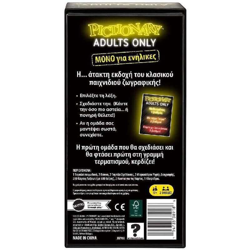 Το Pictionary Adults Only της Mattel είναι ένα επιτραπέζιο παιχνίδι ζωγραφικής και μαντέματος, σχεδιασμένο αποκλειστικά για παίκτες άνω των 18 ετών. Η συγκεκριμένη έκδοση μεταφέρει τον κλασικό μηχανισμό του Pictionary σε ένα περιβάλλον με ενδείξεις που αφορούν ενήλικη θεματολογία, προσφέροντας μια εναλλακτική πρόταση για βραδιές με φίλους. Κάθε ομάδα προσπαθεί να ερμηνεύσει τα σκίτσα των παικτών της μέσα στον χρόνο που ορίζει η κλεψύδρα, με στόχο την ταχύτερη επικράτηση στο ταμπλό.
