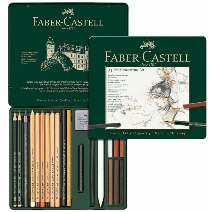Σετ 21 τεμαχίων, επαγγελματικής ποιότητας, σε μεταλλική κασετίνα. Περιλαμβάνει 2 μολύβια Castell 9000 2B & 6Β, 1 μολύβι Pitt Graphite Pure 6B, 2 μολύβια Pitt OILBASE , 4 μολύβια oil-free Pitt Pastel, 6 μολύβια oil-free Pitt Pastel, 1 στικ πεπιεσμένο κάρβουνο Pitt, 1 στικ φυσικό κάρβουνο Pitt, 1 μολύβι φυσικού κάρβουνου Pitt charcoal, 1 μολύβι πεπιεσμένου κάρβουνου Pitt charcoal, 1 γόμα κάρβουνου και 1 σφομύλι