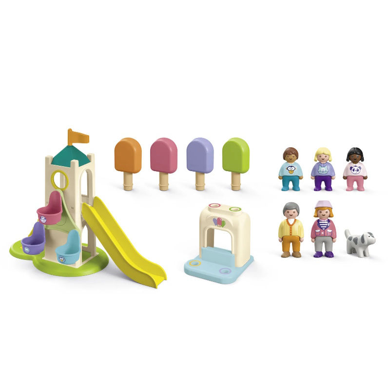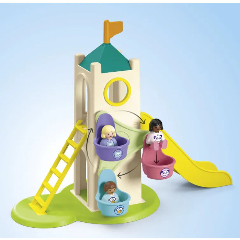 Στην Παιδική χαρά της PLAYMOBIL 1.2.3 η διασκέδαση δεν τελειώνει ποτέ! Οι μικροί μας φίλοι θα ανακαλύψουν πολλά και διαφορετικά παιχνίδια. Πρώτα θα επισκεφθούν τη ρόδα του λούνα παρκ που περιστρέφεται γυρνώντας την ειδική λαβή. Μετά είναι η ώρα για τσουλήθρα. Εδώ υπάρχει μία ξεχωριστή λειτουργία: εάν τοποθετήσετε μία φιγούρα PLAYMOBIL πάνω στην επίπεδη πλατφόρμα στην αρχή της τσουλήθρας, τότε αυτή αρχίζει να μετακινείται προς την τσουλήθρα μέχρι να γλιστρήσει από μόνη της προς τα κάτω.
