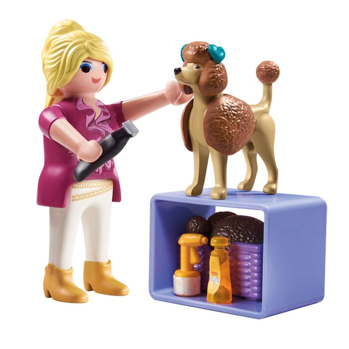 φιγούρα PLAYMOBIL, σκυλάκι, τραπέζι εργασίας, αποθηκευτικό κουτί, πιστολάκι, κουτί σπρέι, σαμπουάν, ξυριστική μηχανή, βούρτσα
