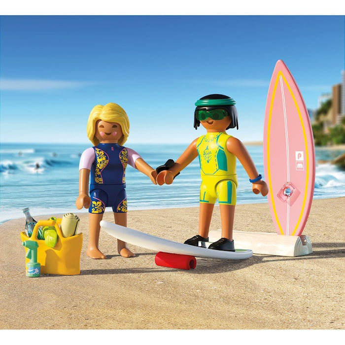 Φιγούρες: 1 άντρας με γυαλιά ηλίου και κεφαλόδεσμο, 1 γυναίκα; Αξεσουάρ: 2 σανίδες του σερφ, 1 βάση για σανίδες του σερφ, 1 κύλινδρος για προπόνηση σερφ, 1 τσάντα παραλίας με πετσέτα και μπουκάλια