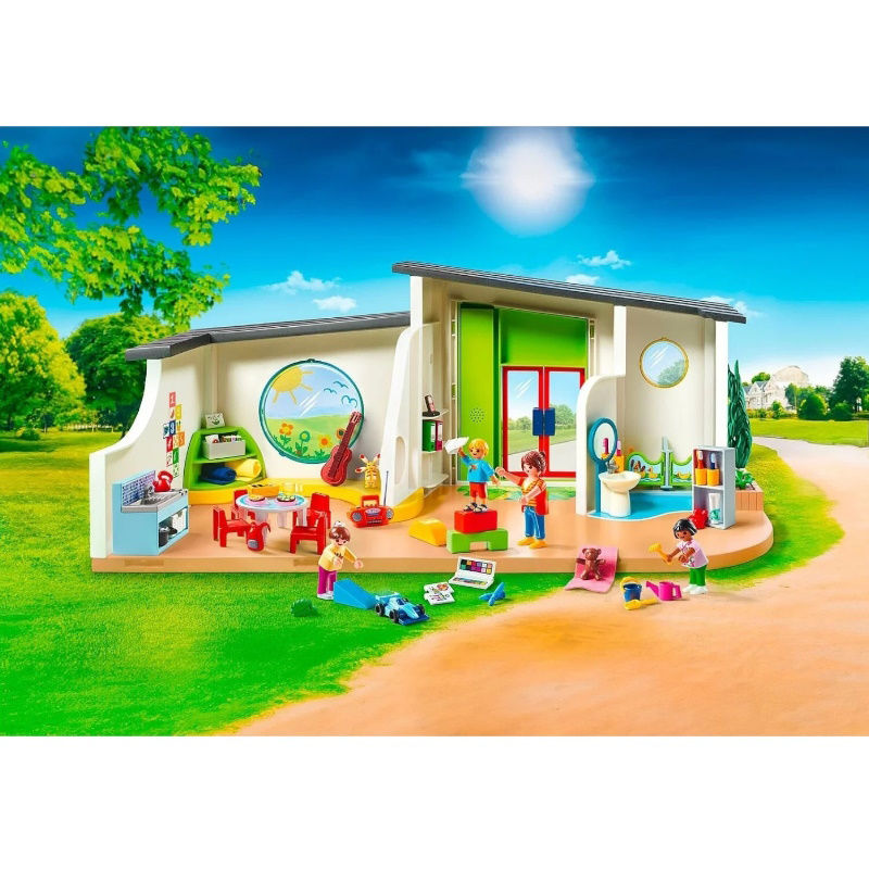 Καλώς ήρθατε στο Νηπιαγωγείο Ουράνιο Τόξο! Είτε παίζετε στην αίθουσα παιχνιδιών, είτε τρώτε μεσημεριανό ή βουρτσίζετε τα δόντια σας, όλες οι δραστηριότητες γίνονται διασκεδαστικές στο νηπιαγωγείο. Η δασκάλα φροντίζει με αγάπη κάθε παιδί. Το σετ παιχνιδιού περιλαμβάνει ένα πλήρως επιπλωμένο κτίριο με playroom, μπάνιο, μικρή κουζίνα και πολλά φανταστικά παιχνίδια. Το κουδούνι δίπλα στην πόρτα εισόδου λειτουργεί.